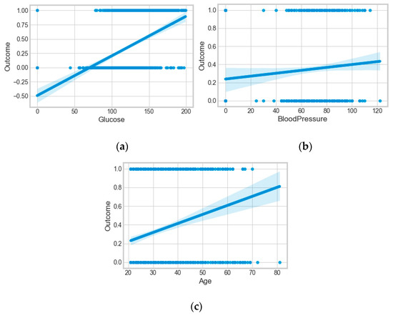 (a) Relationship of the outcome (obesity) with blood glucose; (b) relationship of the outcome (obesity) with blood pressure; (c) relationship of the outcome (obesity) with age.