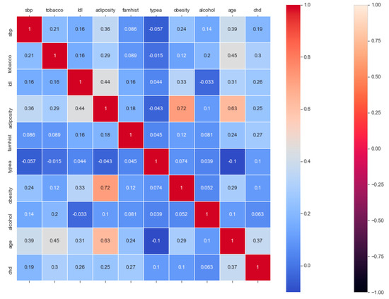 The “cardiovascular-disease” dataset has 462 records and 22 features: “ind” (index), “sbp” (blood pressure), “tobacco”, “ldl” (lipid profile), “adiposity”, “famhist” (family history), “typea”, “obesity”, “alcohol”, “age”, and “chd” (cardiac disease). During the data pre-processing, we included records with age >20 and <60 and excluded features such as “ind” (index).