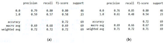 (a) Performance metric of the “SVM” classification with a 5-fold cross validation. (b) Performance metric of the “Logistic Regression” classification with a 5-fold cross validation.