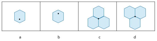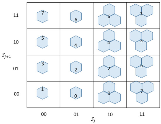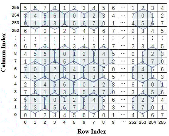 In the turtle shell-based scheme proposed by Liu et al. [23], the turtle shell matrix is consisted of a number of hexagons, called turtle shells, with a size of 256 × 256, as shown in Figure 1. The RM is filled with 8-ary digits, the incremental value of each row is always 1, while the incremental value of each column change of 2 and 3 in turn. Hence, each turtle shell structure in Figure 1 contains distinct values from 0 to 7. In order to further improve the hiding capacity, a location table is constructed as shown in Figure 2. The location table contains all 16 possible situations of turtle shell in the RM. The 16 situations in the location table can be grouped into four categories, as shown in Figure 3. According to the characteristics of the RM, the set of values of elements matching location 1 and location 4 is always {1,3,5,7} and matching location 2 and location 3 is always {0,2,4,6}. Each location in the location table can be represented by , where indicates the i-th row, and indicates the (i+1)-th column, and and belong to {00,01,10,11}.