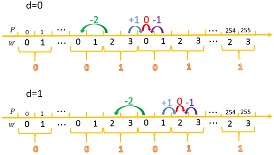 Let be the pixel value and as shown in Figure 7. We always apply the segment [0:1] of to embed secret digit , while apply the segment [2:3] of to embed . To meet this constraint and minimize the modification distortion, we choose the nearest formal segment to embed. For convenience, we define a range front matrix to record the offset values from the current pixel to the range front of embedding. In the case of , the offset is for ; for ; and for and , respectively. In the case of , the offset is for ; for ; and for and , respectively. The resulting offset matrix and range locator function for the entire axis are given in Equations (2) and (3), respectively.