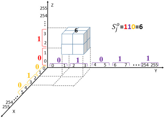 Figure 8 illustrates an example of combining ranges of three axes. Assuming the cover triplet is and the 3 MSBs of the secret segment to be embedded is . By applying the range locater, the embedding range of each axis can be determined independently as , and . As shown in the figure, the basic structure obtained by combining the located ranges is . Comparing with Figure 6, the basic structure obtained by applying to range locater coincides with the structure labeled 6. This result demonstrates that the range locater can be treated as an efficient tool for the outer layer of embedding scheme.