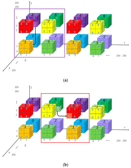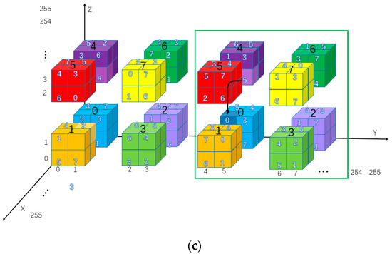 The cubic mini-SuDoKu matrix is a 256 × 256 × 256 matrix that contains 64 × 64 × 64 sub-cubes of size 4 × 4 × 4. Each sub-cube contains eight basic structures of size 2 × 2 × 2. The basic structures are labeled with bold Arabic numerals as shown in Figure 6. Elements of each basic structure are randomly assigned with distinct values of 0 to 7. The resulting RM is denoted as.