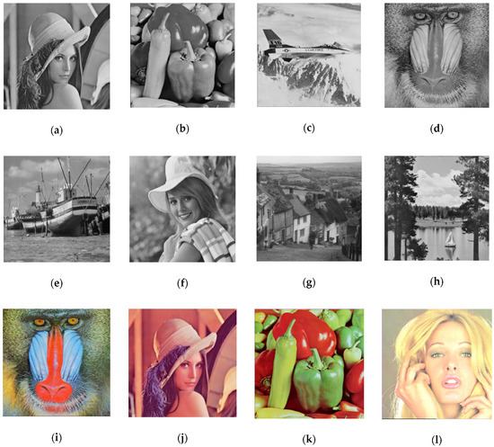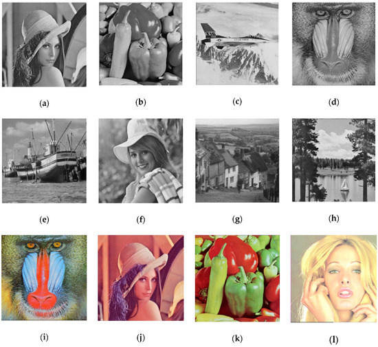 Twelve cover images with size 512 × 512: (a) Lena; (b) peppers; (c) airplane; (d) baboon; (e) boat; (f) Elaine; (g) Gledhill; (h) sailboat; (i) baboon (RGB); (j) Lena (RGB); (k) peppers (RGB); and (l) Tiffany (RGB).