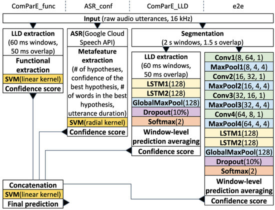 The confidence scores from all the models are concatenated and fed to a metamodel using a linear SVM as depicted in Figure 1. This model is trained on a development set, while the low-level classifiers are trained on a training set. As a performance metric, unweighted average recall (UAR) is calculated. The neural networks were developed using TensorFlow [46], the other models were designed in RapidMiner [47].
