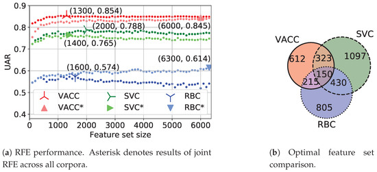 According to the joint RFE experiments (marked with an asterisk in Figure 2a) across all three corpora, the entire set of the 6373 ComParE functionals should be used for joint classification since the performance on VACC and RBC starts dropping directly after the first RFE iterations and the performance on SVC does not reach the values of individual RFE. In particular, it can be seen in Figure 2a that the performance of the entire functional set on RBC is always higher than the performance of any of its subsets. In other words, the 150 common functionals visualised in Figure 2b are important but not enough to classify RBC utterances reliably.