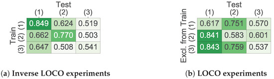 Second, we conduct leave-one-corpus-out (LOCO) and inverse LOCO experiments with the ComParE_func model to estimate its behaviour on unknown corpora. In both cases, the entire ComParE feature set is used without RFE and the model is trained and tested on the corresponding partitions from Table 1. Results of both experimental series are depicted in Figure 3. Inverse LOCO means that the classifier is trained on one corpus (rows in Figure 3a) and individually tested on each of the corpora (columns in Figure 3a). LOCO means that the classifier is jointly trained on all corpora but one (rows in Figure 3b) and individually tested on each of the corpora (columns in Figure 3b). Let us denote the matrix from Figure 3a as A, the matrix from Figure 3b as B, and their elements as and respectively. and are considerably greater than the other off-diagonal elements of A, demonstrating a clear relation between VACC and SVC. The other off-diagonal elements of A are close to a random-choice UAR of 0.5. However, is greater than , meaning that the model trained on RBC performs better on VACC than on the RBC test set. In other words, training on the complexity-identical setup allows the model to capture true acoustic patterns that are also typical for the classical H-M AD setup. However, the opposite statement does not work due to collateral factors influencing the users’ behaviour in the latter setup only and which cause the model to overfit. SVC and RBC do not exhibit such a relationship probably due to the difficult acoustic conditions of SVC (it is the only corpus containing not only indoor recordings but also outdoor recordings made by a distant-microphone). Another remarkable observation is and being greater than and meaning that merging RBC and another corpus improves the classification performance on RBC compared to using the RBC training data only. This positive result motivates us to apply Algorithm 1 rather than just merging examples from different corpora.