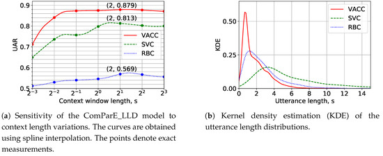 Next, we determine the optimal acoustic context length for H-M AD. The segmentation into context windows allows us to increase the number of examples and partially offsets the lack of training data for neural networks. Context windows are extracted with an overlap of 75% of their length. The windows containing only silence are excluded from consideration. We suppose the most important vocal addressee patterns to appear at short context lengths of around 1 s and therefore use a logarithmic scale depicted in Figure 4a. For each context length, the ComParE_LLD model is examined on the LOSGO cross-validation. The resulting UAR is averaged over all folds. We confine to a context length of 2 s in our experiments with the ComParE_LLD and the e2e model in Section 5.4 since this value is optimal for all three corpora, though the maximum of the KDE values of their utterance length distributions depicted in Figure 4b are around 1 s for VACC and RBC and around 3 s for SVC. The differences between the average utterance lengths appeared due to various interaction complexity levels supported by the systems. Two-second speech fragments were also shown to be sufficient for H-M AD in English [14].