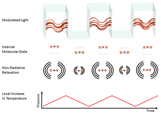 By modulating the light intensity, a periodic pressure variation can be generated, which in turn can readily be captured with a sound-detecting device like a microphone, a lever, or a tuning fork. This may be done by electronic means [33,34], opto-acoustic components [35], or mechanical choppers [36] in order to adjust the modulation frequency to the resonance frequency of the acoustic resonators. Figure 1 schematically depicts the processes involved in generating a sound wave. The type of modulation may vary, and the type of light source may limit the available soundwave excitation frequencies. When relying on using the light source’s driving current for intensity modulation, then thermal light sources are currently limited to frequencies on the order of 30 Hz [37]. Higher modulation frequencies using thermal sources may be achieved using a chopper. On the other hand, light-emitting diodes (LEDs) and diode lasers may easily be intensity modulated via their driving current. Frequencies up to several MHz can be achieved in theory. When using single-mode lasers, the use of wavelength modulation is a further option [34,38] to generate a photoacoustic signal. In any case, the intensity modulation frequency νM range is limited by fundamental considerations: On the one hand, it should be faster than the inverse of the molecular diffusion time 1/tdiff, because otherwise no pressure wave may form. On the other hand, the modulation frequency has to be slower than the inverse of the molecular relaxation time 1/τR, such that the system may react to changes [39].