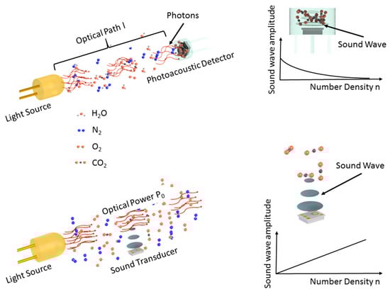 Figure 2 schematically shows the detection of a representative trace gas (carbon dioxide—CO2), the main constituents of air (nitrogen—N2 and oxygen—O2), as well as often occurring and strongly varying humidity (water—H2O), which may also be the cause for cross-sensitivities. It depicts the two types of photoacoustic setups that can be distinguished depending on whether the gas mixture is to be analyzed is in direct contact with the sound detection device or not.