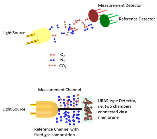 Comparison between a nowadays commonly used NDIR setup (top) and the URAS setup (bottom). (Top) Two detectors with different spectral response functions act as a measurement and reference channel, respectively. (Bottom) The URAS detector consists of two chambers filled with the gas to be detected and connected via a membrane. The optical path is divided into a reference part with a fixed gas composition and a measurement part containing the analyte.