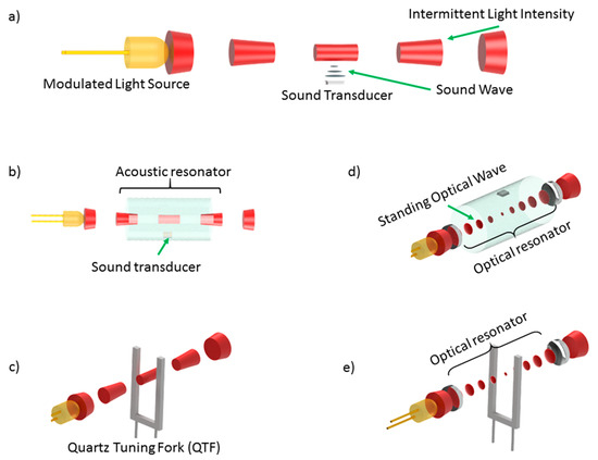 A schematic not-to-scale depiction of various basic setups for photoacoustic spectroscopy with different degrees of complexity. (a) The most basic setup is popular with several commercial manufacturers for its simplicity: A modulated light source generates an intermittent light beam, which in turn generates a photoacoustic signal. The amplitude of the sound wave is measured using a sound transducer, (b) Acoustic resonators are used to enhance the generated acoustic wave, (c) A quartz tuning fork (QTF) may serve as a low-cost narrow bandwidth resonator, (d,e) To increase the available optical power, an optical resonator or multi-pass cells may serve to multiply the photoacoustic signal.
