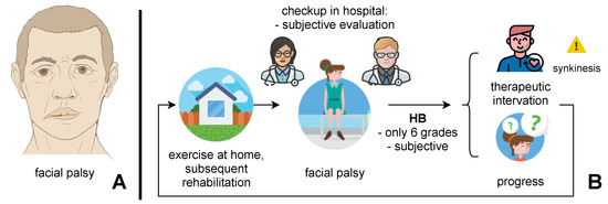 (A) illustrates facial palsy. Note the difference between the left (sick) and right (health) parts of the face. Image source [22]. (B) ilustrates problems with clinical classifications, e.g., House–Brackmann classification is observer dependent with six grades only.