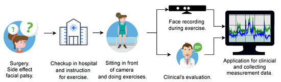 The measurement scheme is shown in Figure 2. The measurement takes place during checkups, first before the surgery and then repetitively based on a defined schedule. The patient is asked to perform a series of exercises (see Table 3) using the mimetic muscles during the examination, and the clinician evaluates this exercise numerically. A disadvantage, however, is that these measurements are strongly subjective: it depends on the evaluation of clinician during the given examination. However, this assessment strongly influences rehabilitation planning as well as any other actions.