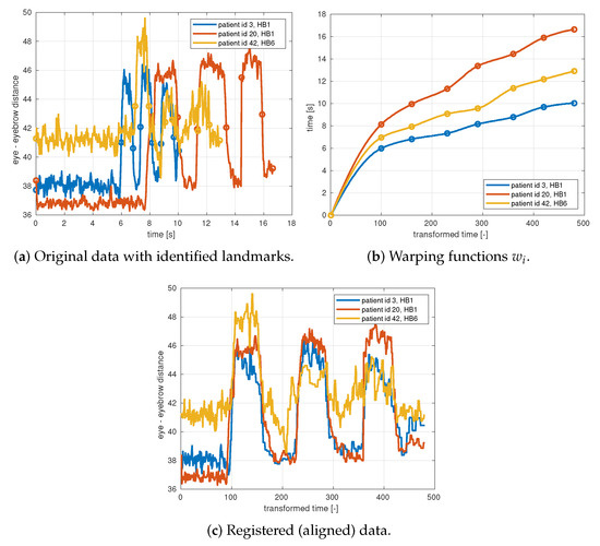 In this section, we briefly describe the necessary preprocessing of the data. Each patient performs the exercises at different times and at different speeds. In order to do a further analysis, there is a need for alignment (registration) of the data. Figure 4 illustrates the original data and the desired alignment for the distance between eye corners and eyebrows for three different patients performing Raising (see Table 3).