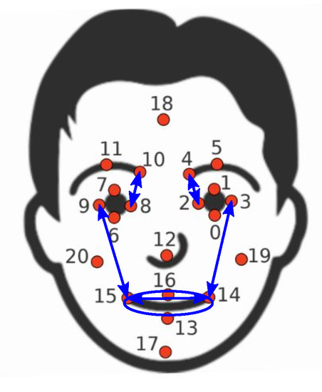 where and denotes two points on the right and and on the left side of the face. For Raising and Frowning we use the distance between the inner eyebrows (points 4 and 10) and inner corners of the eye (points 2 and 8). For Smiling and Baring we use the distance between the outer corners of the mouth (points 14 and 15) and that between the outer corners of the eye (points 3 and 9). Eye corners were chosen as reference points since they were found to be the most stable during the exercises.