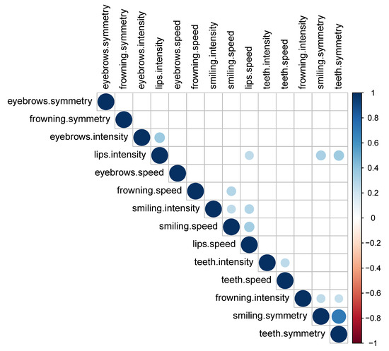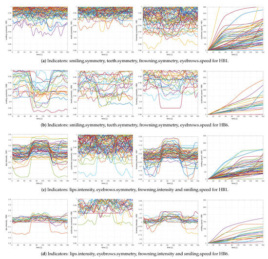 The choice of exercises and points of interest is driven mainly by the ability of Kinect to reliably identify the location of the points and their movements, see Figure 6 for illustration. The full list of indicators is shown in Table 7. Figure 7 illustrates differences in selected indicators between fully recovered patients (HB1) and patients with most severe mimetic dysfunction (HB6). Patients with HB1 (recovered) have symmetry indices closer to one, especially for exercises with mouth (smiling, teeth), compared to patients with HB6 (sever mimetic dysfunction). This demonstrates asymmetry between left and right halves of the face for HB6 patients. Regarding intensity indices, patients with HB1 show values farther from zero compared to HB6 patients. This means that the range of motion during exercises is larger for HB1 compared to HB6. Comparison of the shapes of speed indices (warping functions) reveals that patients with HB1 tend to perform the exercise faster than patients with HB6 (warping function is steep at the beginning and flat in the middle for HB1).