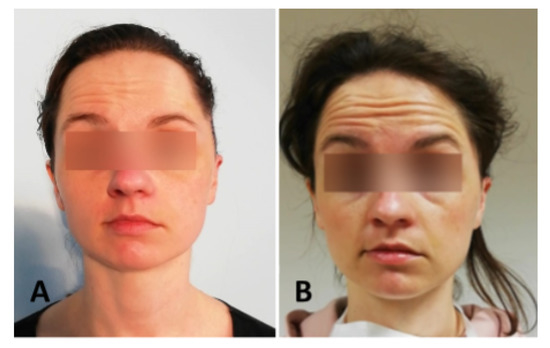 Patient with facial nerve dysfunction raising the eyebrows; (A) HB6—no movement on the left side; (B) HB3—moderate movement.