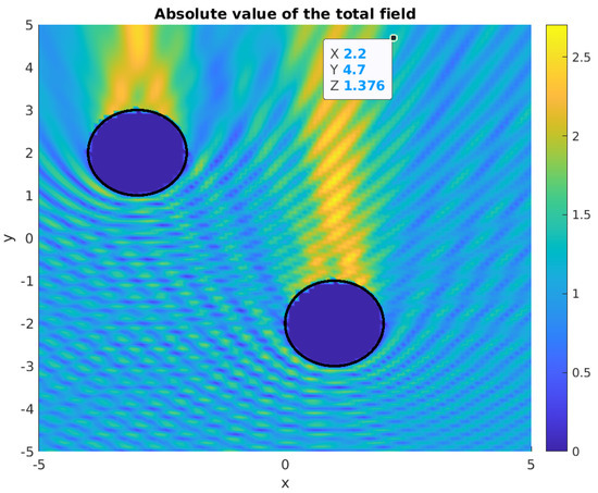 For the pairs of disks that are given by , we have simulated the scattered waves while using the simulation package -diff in Matlab [15]. In this framework, it is also possible to choose different boundary conditions and point sources for the incident waves. Figure 1 and Figure 2 depict sample simulated waves.