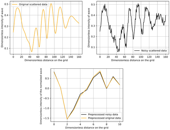 A sample simulated scattered data (top left) and a corresponding noisy data (top right) together with the preprocessed version of these data sets (bottom).