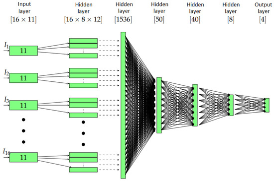 The application of each two-dimensional convolution window in (3) to the input vectors of length 11, results in a vector of length . An arrow in Figure 5 corresponds to one of the convolutions in (3). This is performed in 12 cases, such that we obtain a matrix of size 8 × 12. The total size of the first hidden layer is 16 × 8 × 12 because we have 16 incident waves.