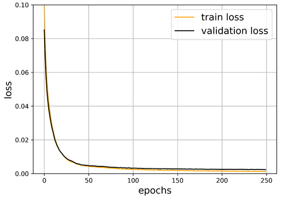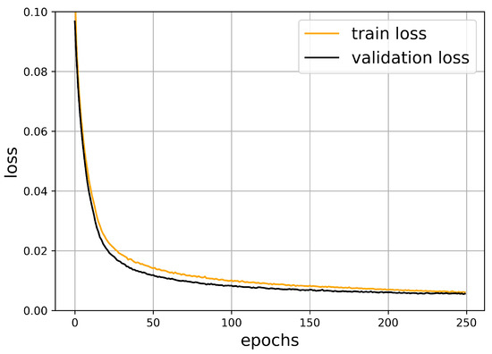 The oscillation of the loss function is accompanied with the optimization algorithm. The validation dataset is smaller and it was not used in the minimization procedure, such that it exhibits larger oscillations. Figure 6 shows this behavior, which is typical for neural networks.