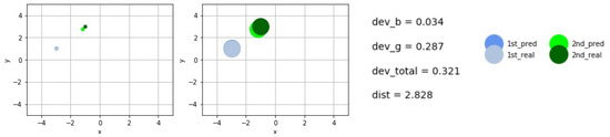 The larger disks represent the real size of the scattering objects, while the smaller show their midpoints in order to demonstrate the accuracy of the predictions. The deviations of the predicted and real midpoints are shown next to the graphs. The total (real) distance between the centers is given shortly by dist. We have used the short notations and for the values of deviations between the predicted and real centers, while b and g refer to the and the centers, respectively. These are summed up to obtain the variable .