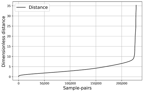 The distance distribution of the waves. x axis: the number of sample-pairs with less distance than y.