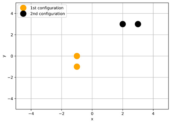 In our case, the training data consist of a set of vector-pairs . Here corresponding to a geometrical setup, which can be identified with the two coordinate pairs of the disk-midpoints, while denotes the dimensionless wave intensity in our observation points, as shown in Figure 3. Shortly and formally: the further task is to predict and while using .
