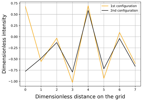 The dimensionless wave intensity is measured on the bottom edge of the computational domain in 161 gridpoints. For a geometrical setup , this gives . The choice of 161 is a good balance: this means approximately eight measurement points per the dimensionless wave length , which is a minimum for identifying a scattered wave. Using more gridpoints could lead to extremely long simulation time and an unnecessarily large number of parameters.