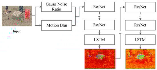 For the input image, gaussian noise ratio and motion blur are used to evaluate the level of the rain condition. Then we use a recurrent neural network to find the areas in the input image that need to be focused and generate the attention map. These areas are mainly the region where the rain streaks and its surrounding structures. This method enables the generated network to better deal with the areas affected by rain streaks. In a recurrent neural network, each module consists of a five-layer residual network (ResNet) and an LSTM unit [], as shown in Figure 2.