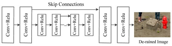 The generative and discriminative network includes a generative network and a discriminative network. The generative network is used to produce the most realistic image with the rain removal. To get more contextual information, the network has 14 Conv-Relu blocks, and we add skip connections to solve the gradient disappearance problem. The specific structure is shown in Figure 4.