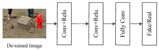 The discriminative network is used to differentiate fake images from real ones []. A few GAN-based methods adopt global or local image-content consistency in the discriminative part. The global discriminator looks at the whole image to check, while the local discriminator looks at small specific regions. This paper uses a local discriminator to make decisions, but the network cannot find which areas remove rain streaks. To solve this problem, we mainly focus on the attention map generated by a recurrent neural network to discover these areas. Our goal is to guide the discriminant network to focus on the areas indicated by the attention map. Specifically, the discriminant network in this paper consists of seven layers of Conv-Relu and a full connection layer, as shown in Figure 5.