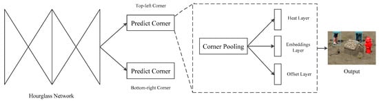 Pedestrians on rainy days are special because most pedestrians wear raincoats or carry umbrellas, so there is a lot of occlusions among pedestrians. Aim at the problem of occlusion, the pedestrian detection module detects a pedestrian as a pair of keypoints—the top-left corner and bottom-right corner of the bounding box. For the images after removing rain streaks, this module first uses the hourglass networks as the backbone network to extract image features []. The output feature map is processed by corner pooling to obtain the position information of corners. We detect the corner position of pedestrians through two sets of heat layers and then optimize the loss of the embedded layer to make the distance between the two corners embedded into the same object smaller and smaller. At the same time, we calculate the loss of the offset layer, and adjust the position of corners to generate a more compact prediction box, as shown in Figure 6.