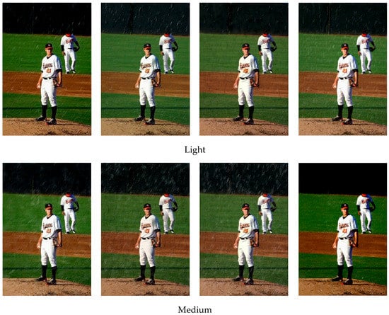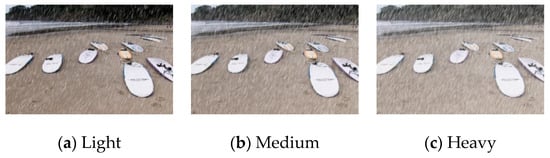Although there are many large-scale synthetic datasets [,,], they lack the labels which contain information for various rain density levels, and there are few pedestrian targets in the image. Thus, this paper builds a new dataset containing pedestrian targets and rainy labels. This paper selected the COCO2014 [] as raw dataset and extracted the pedestrian targets from it, finally build the pedestrian dataset in rainy scenario. The obtained dataset with a total of 66,808 images, in which 45,174 are regarded as training images, and the remaining 21,634 images are test set. The number of pedestrians in each image varies and the scale is also dynamic, with a total of 273,469 pedestrian samples. Then we use Photoshop to synthesize rainy scenarios, with noise ratios of 5–35%, 35–65%, 65–95%, and fuzzy pixel values of 5–10, 10–15, and 15–20, respectively []. The synthetic image for the three rain conditions is shown in Figure 9.