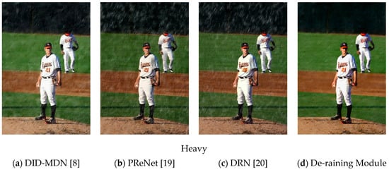 To visually demonstrate the improvements obtained by the de-raining module on the synthetic dataset, results on the sample image is presented in Figure 10. The de-raining module performs better on the image of medium and heavy rain. The pedestrians covered by rain streaks can be detected after processing. Previous methods tend to de-rain under specific rainy conditions. In contrast, the proposed method is able to deal with different types of rain conditions. In addition, it can be observed that the proposed method achieves better results in terms of effectively removing rain streaks while preserving the image details. However, it performs worse than DRN in light rain image processing and leaves rain streaks. In general, the de-raining performance of our de-raining module is better than the recent state-of-the-art de-raining methods.