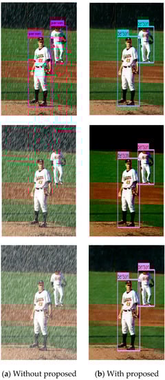 Rain is a very common kind of weather in real life, it can badly affect the visibility of a camera. Especially in heavy rain, the rain streaks accumulate seriously, which result in blur and distortion in acquired images. This type of interference considerably degrades the accuracy of pedestrian detection [,,]. Smart traffic has become a modern trend, the development of which countries pay a great deal of attention to. A pedestrian detection algorithm which has high accuracy is needed worldwide. For this reason, it is important to realize pedestrian detection on rainy days.