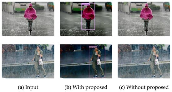 From Table 2 and Table 3, we can find that the proposed algorithm restores the detection accuracy of the original image. For the scenarios of light, medium, and heavy rain, the proposed algorithm increases AP by 21.1%, 48.1%, and 60.9%. The results also show the necessity of the de-raining module. Previous methods could not accurately detect pedestrians even through the training of pedestrian datasets on rainy days. In contrast, our method can accurately detect pedestrians on rainy days.