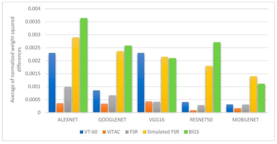 It is important to note that, in spite of having the best performance, Resnet50 shows in most cases the smallest updates both in weights and accuracy values. The reason can be found in the deep architecture of Resnet50 that allocates smaller weight updates to each layer, and thus, the average normalized weight differences are lower.