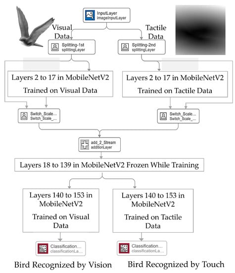 Accordingly, the hybrid network illustrated in Figure 5 is developed by stitching different layers of two MobileNetV2 architectures trained on visual and tactile data with layers 18 to 139 frozen. This hybrid architecture is developed in Matlab R2020a platform using the Deep Network Designer. It is worth mentioning that in this paper, we address all layers according to their labeling in Matlab Deep Network Designer.