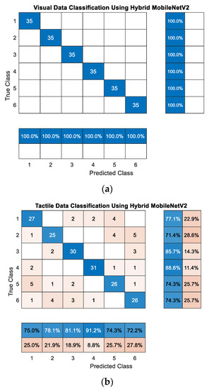 In order to produce a network with two input streams, we set an image input layer of size 224 by 224 by 6 followed by two custom-designed splitting layers separating the two input streams, i.e., visual and tactile inputs. The initial input to the network is in the form of a 6-channel image of size 224 by 224. The first three channels are allocated to RGB values of visual data, and the last three channels contain tactile data. If a visual image is to be classified, the tactile channels are set to zero and vice versa. The image input layer normalizes the input data using z-score, where the mean and standard deviation of each data channel is extracted and set from the initially trained networks. The input data passes through layers 2 to 17 of the associated MobileNetV2 layers trained on visual/tactile data. Two custom switch-scale layers, as illustrated in Figure 5, are introduced to eliminate the output of layers 2 to 17 for the stream that is not supposed to participate in classification (i.e., the stream with the input from zero-channels). The switch-scale layer takes two inputs. Input 1 is the output of the splitter layer, and input 2 takes the activations from Layer 17 of the MobileNetV2. The variance across each of the three-channel data from input 1 is measured to determine if the data for that stream corresponds to the zero channels. If the variances for all three channels are equal to zero, which means the data are from zero-channels, a zero array of the size of the activations at layer 17, i.e., 56 by 56 by 24, is generated and multiplied with the activations from layer 17 (i.e., input 2 of the switch-scale Layer). Otherwise, an array of ones of size 56 by 56 by 24 is used to keep the activations from layer 17 unchanged. The output of the two streams is then summated and passed through layers 18 to 139 with frozen weights. From layer 140 to the final layer, i.e., layer 154, as illustrated in Figure 5, the information passes through two parallel paths with finely tuned weights on the corresponding data for classification purposes. It is worth mentioning that the stitched network is only used for prediction purposes, and the weights remain unchanged. The hybrid network outputs an accuracy of 100% on visual object recognition and an accuracy of 77.63% on tactile data while achieving a compression ratio of 1.4284 (i.e., two separate networks occupy the memory of 16,644 KB while the hybrid network has a size of 11,652 KB). It is worth mentioning that this performance is comparable with the case where all layers of MobileNetV2 are tuned on tactile data (i.e., 78.57%) and is 34.76% higher than the case where all layers of the network are frozen. Figure 6a,b depicts the confusion matrix of the hybrid visuotactile object recognition architecture on visual and tactile data where the objects 1 to 6 correspond to classes: bird, chair, hand, head, plane and quadruped, respectively from the dataset described in Section 3.3.