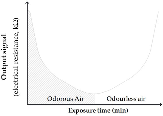 where: R is the electrical resistance supplied by the sensor; A is a constant defined by the material (e.g., TiO2, ZnO, SnO2, etc.); C is the concentration of analyzed gas; and α is the slope (e.g., experimental quantity of the gas). Figure 1 reports the general trend of the output signal response provided by the sensors, expressed in terms of electrical resistance (e.g., kΩ) with respect to exposure time (e.g., minute) and presence of odour and odourless events. As shown, when the sensor is exposed to odour, its output signal in terms of resistance decreases, while, when exposed to odourless air, the signal in terms of electrical resistance returns to the initial reference base values.