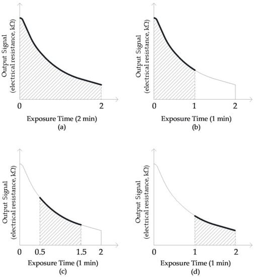 For the experimental activities, in addition to considering the data of the complete sensors response curve (i.e., Figure 2a), piecemeal signals lasting 1 min, such as the rise period (first 1 min of acquisition, Figure 2b), the intermediate period (intermediate, 1 min of acquisition, after 30 s from the start, Figure 2c), and the peak period (last 1 min of acquisition, Figure 2d), during the 2-min acquisition time, were extracted and investigated.