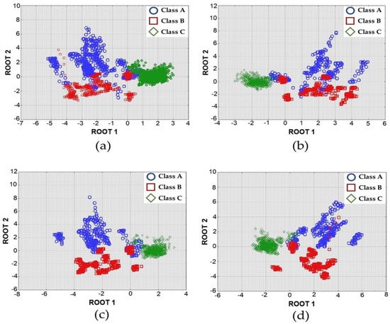 Figure 4 shows the scatter plots produced from the linear discriminant analysis (LDA) of the “training” dataset, with all the detected data, showing a distinction among Class A, Class B, and Class C by using the (a) complete response curve data and extracted data for the (b) rise data, (c) intermediate data, and (d) peak data.