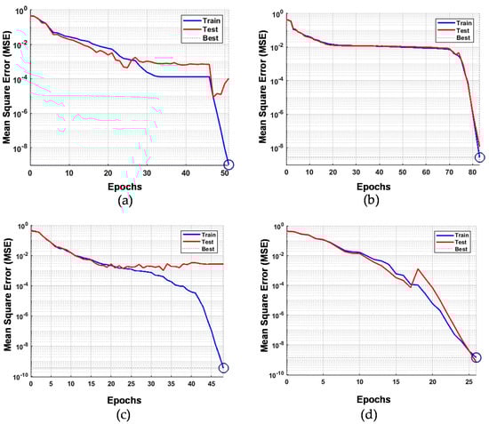 ANN performance at investigated extracted signal ((a) complete response curve; (b) rise period; (c) intermediate period; (d) peak period) with respects to mean square error versus the number of epochs.
