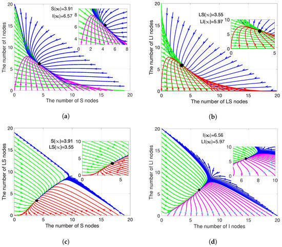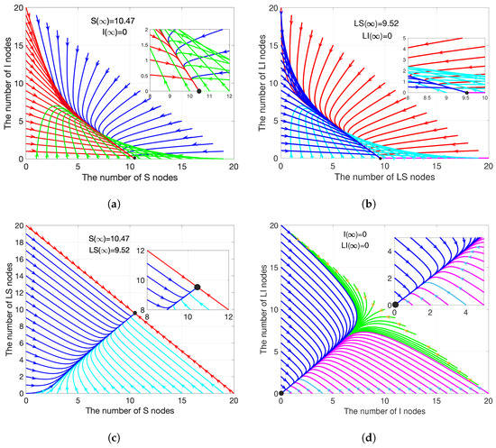 This part aims to test Theorem 1 to Theorem 4. Firstly, eight two-dimensional feasible regions are constructed through the combinations of various state variables to analyze their relationships. Subsequently, suppose that , , , , , and . Therefore, whether or , the total number of sensor nodes is constant at 20 (i.e., ), including the initial value (i.e., ).