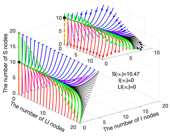 In addition, if and only if and . Moreover, (S, I, ) tends to when t tends to infinity, and the maximum invariant set in is . Thus, Theorem 3 has been proved, after considering the La-Salle Invariance Principle [48]. □