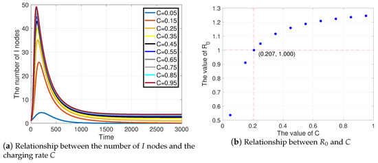 The influence of charging rate is discussed detailedly by comparing the quantity of I nodes with various C, as shown in Figure 6. Based on (55), C directly affects , thereby affecting the prevalence of malware. As C increases, the peak of the quantity of I nodes keeps growing and gradually saturates, as shown in Figure 6a. Under ten sets of C, only and clear the malware. After simple calculation, we find, as C increases, that grows likewise, as illustrated in Figure 6b. Specifically, , when , which indicates, when , that the malware is eliminated if and prevalent if .