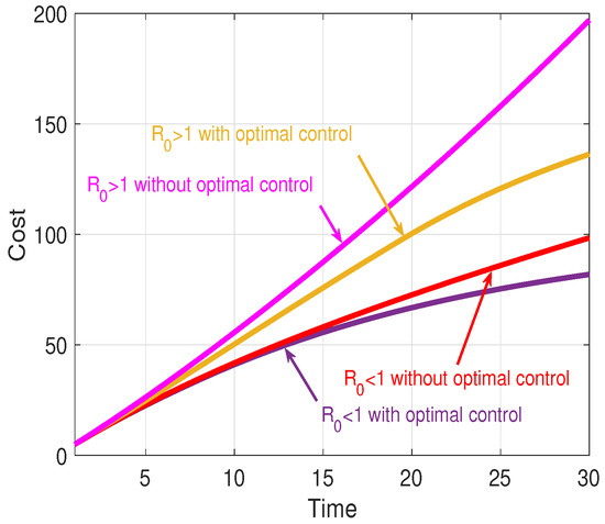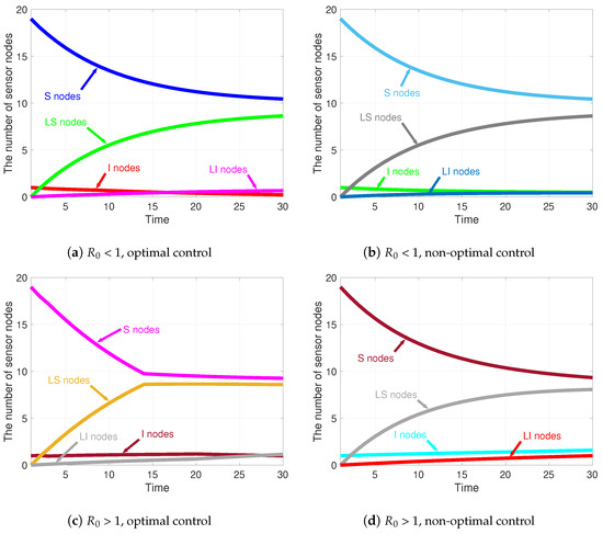 Figure 8 illustrates the cost under the four cases. From Figure 8, it can be seen that the cost with optimal control is lower than that of the control group all of the time, which indicates the validity. Specifically, in Case 1, the cost finally reaches 81.9044; in Case 2, the cost finally reaches 98.4576; in Case 3, the cost finally reaches 162.8256; and, in Case 4, the cost finally reaches 196.9237. The cost depends on the number of I nodes based on (55). Thus, the cumulative cost is another embodiment of variation on the number of I nodes. It can be seen, even under optimal control, that the number of I nodes when is still greater than that when .