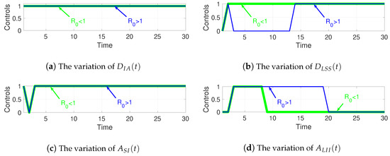 Figure 9 depicts the variations of the control variables when and obtained from (57)–(60). Among them, Figure 9a shows the variation of , Figure 9b shows the variation of , Figure 9c shows the variation of , and Figure 9d shows the variation of .